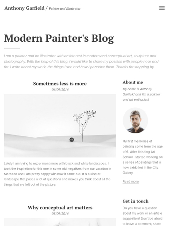 This is the template for any person with an artistic soul. Create blog posts about art events, your own creations, new trends in design and all other artistic news. This clean design lets all images shine and supports your creativity. Blog posts can be added in no time so your readers will always know what is happening.