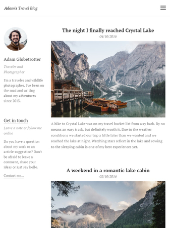 Get your bags ready! Share news and stories from your travels with this template. Write about your experiences, add photos and bring your readers to your favorite places with you in their imagination. This well-structured design will enhance your stories and let them shine.